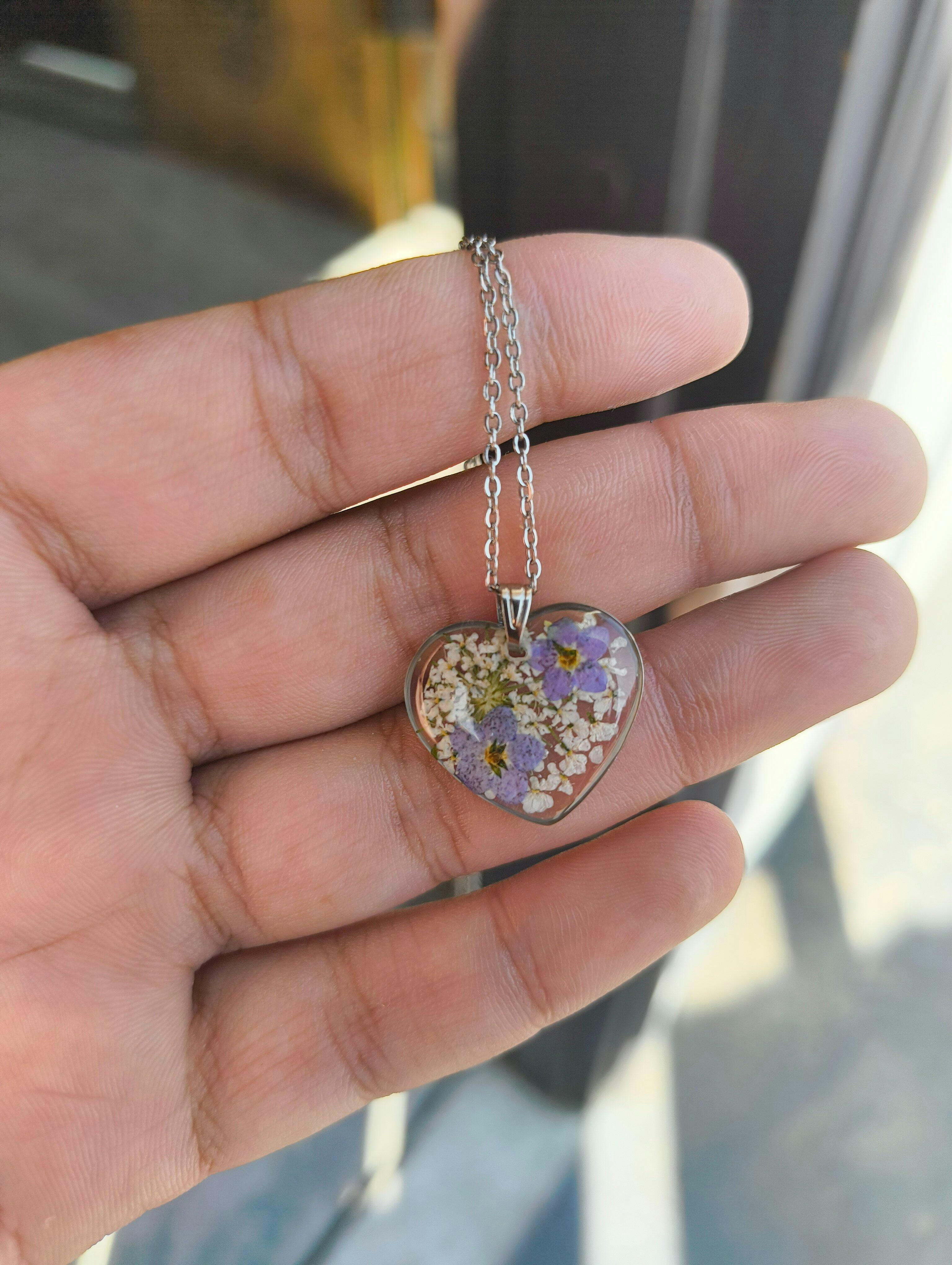 Encased in crystal-clear resin, the preserved flowers rest within a heart-shaped bezel, their pale blues and soft whites suspended in eternal stillness. Hanging from a 42 cm chain, Esme sits close to the heart — where all precious memories belong.